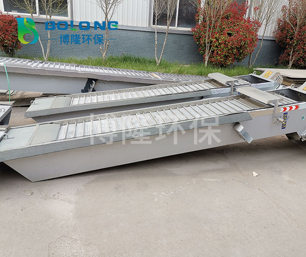 耙齒鏈運(yùn)轉(zhuǎn)到設(shè)備的上部時(shí),由于槽輪和彎軌的導(dǎo)向,使每組耙齒之間產(chǎn)生相對(duì)自清運(yùn)動(dòng),絕大部分固體物質(zhì)靠重力落下。另一部分則依靠清掃器的反向運(yùn)動(dòng)把粘在耙齒上的雜物清掃干凈。